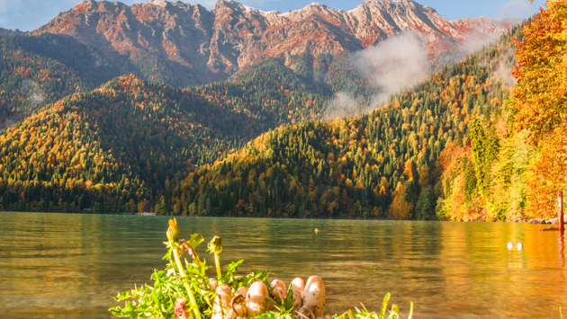 Жемчужина Абхазии — озеро Рица. Конечно, она хороша в любое время года. Осенью кристально чистое горное озеро обрамляют уже золотистые вершины — вид ни чем не уступает итальянскому Комо. Только рядом вы сможете пообедать не пастой, а мамалыгой и копченым мясом с соленьями. Туристов, кстати, будет значительно меньше, поэтому Рицу осенью вдвойне приятнее посещать.