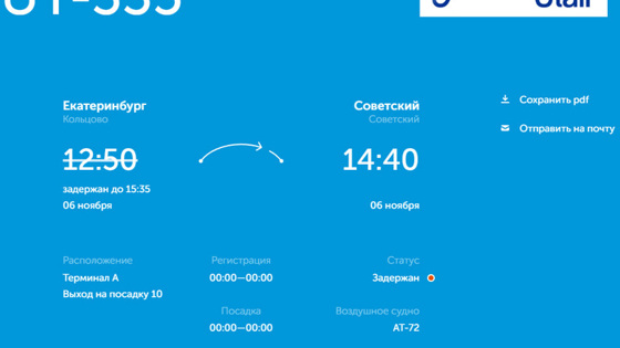 «Самолет AT-72 должен был вылететь из Екатеринбурга в Советский 6 ноября в 12:50 часов по местному времени и прибыть в 14:40 часов. Время вылета воздушного судна перенесено на 15:35 часов», — следует из онлайн-табло Кольцово. Причина отмены рейса UT-335 не уточняется.