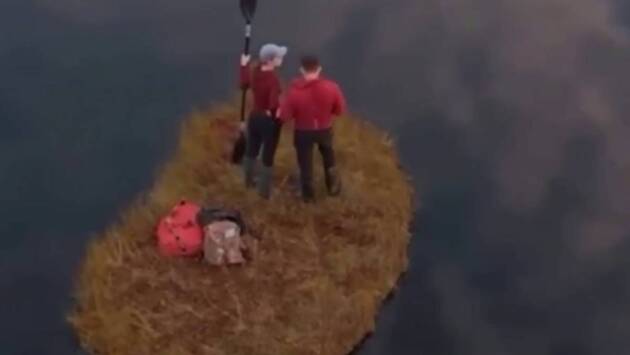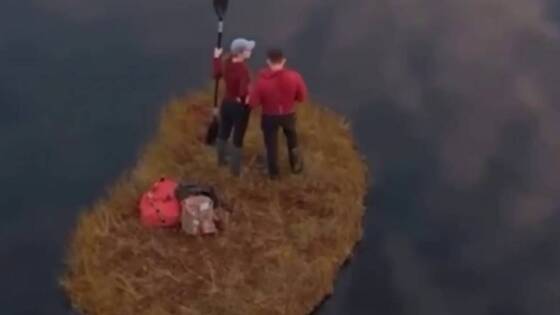 На выложенных кадрах видно, как мужчина с веслом в руках встает на оторвавшийся от берега поросший травяной остров, после чего отталкивается и выплывает на середину водоема. Остров держит вес и не проседает под ездоком.