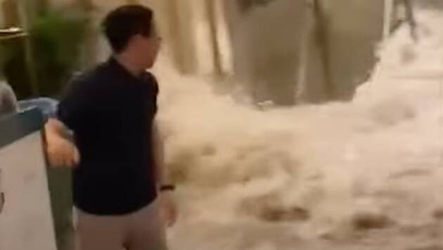 Поток воды ворвался в отель в Гонконге, сбил с ног постояльцев и попал на видео