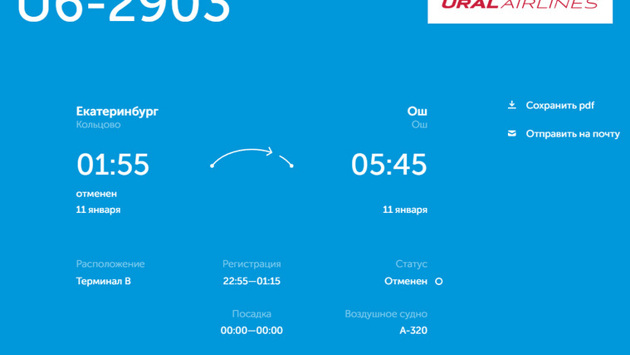 В екатеринбургском аэропорту Кольцово авиакомпания «Уральские авиалинии» отменила ночные рейсы 11 января в Ош (Киргизия) и Худжанд (Таджикистан). Информация об этом появилась на онлайн-табло аэропорта.