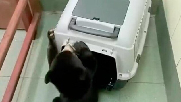 Следующим этапом стало поднятие и транспортировка медведицы в боксе. Причем все стадии обучения прошли хорошо, благодаря чему она уже спокойно и быстро сама заходит в переноску, когда ее ставят в комнате.