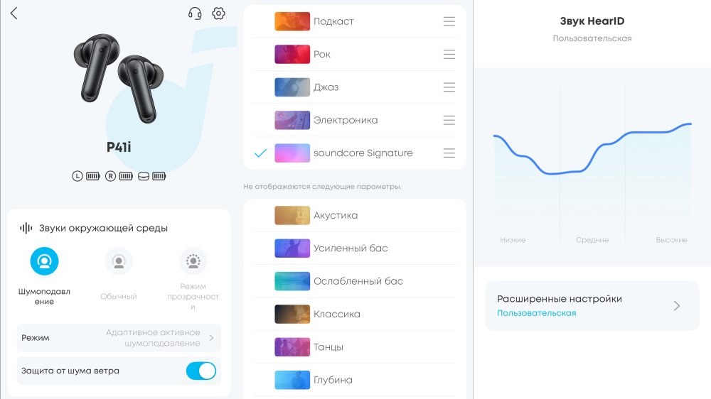 V-образная настройка звука P41i, то есть с приподнятыми низким и высоким частотными диапазонами, отлично подходит для поп-музыки, хип-хопа, электроники, рока и джаза, придавая композициям энергию и драйв. Да, инженерам Soundcore удалось избежать завала средних частот, однако, для любителей классической музыки, где важна детализация и нейтральность, звук "из коробки" может показаться слишком "тяжелым" из-за превалирования басов. Проблема частично решаема благодаря фирменному приложению Soundcore, где пользователь получает в свое распоряжение отличные инструменты для тонкой настройки. Здесь есть десятки предустановленных звуковых профилей и полноценный эквалайзер с возможностью ручной настройки, а также функция Hear ID. Эта технология проводит тест на особенности вашего слуха и музыкальные предпочтения, после чего создает персонализированный звуковой профиль, максимально подходящий именно вам. Тем не менее топовым наушникам, особенно с арматурными высокочастотными излучателями, в плане точности и детализации звука, что особенно важно в среднечастотном диапазоне, Soundcore P41i уступают.