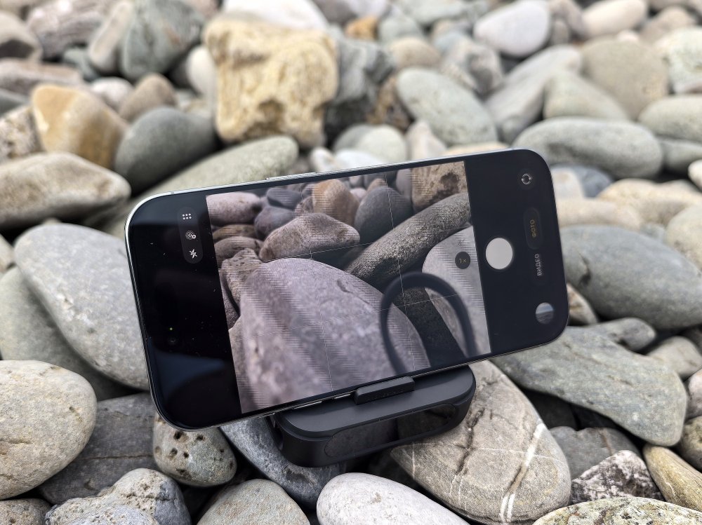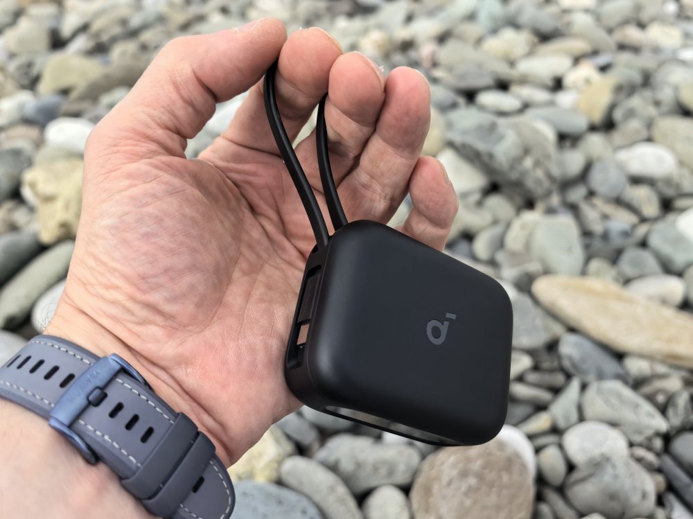 На боковой грани кейса находится как бы ремешок для переноски. Но это не просто ремешок, а полноценный встроенный кабель USB-C. Вытянув его, вы превращаете свой кейс в пауэрбанк с аккумулятором емкостью 3000 мА·ч. iPhone 16 Pro и Samsung Galaxy S24 можно зарядить на 50% и 45% соответственно (проверили - примерно так оно и есть). Для путешественника, оказавшегося вдали от цивилизации с разряженным смартфоном, это может стать настоящим спасением. Кстати, под крышкой кейса закреплен переходник на Lightning для зарядки старых версий iPhone.