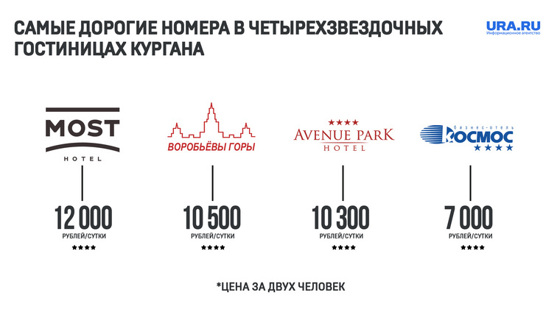 Самые дорогие апартаменты Кургана оказались в четырехзвездочном отеле «МOST». Стоимость номера на двоих человек стоит от 12 тысяч рублей в сутки. Ранее сообщалось, что гостиница жены курганского бизнесмена получила категорию «четыре звезды».