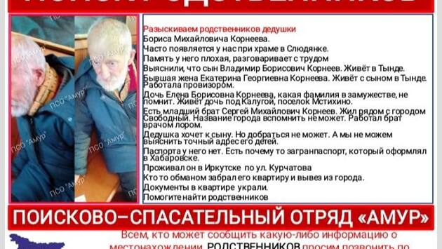 Разыскиваем родственников дедушки Бориса Михайловича Корнеева, часто появляется у нас при храме в Слюдянке. Память у него плохая, разговаривает с трудом. Выяснили, что сын - Владимир Борисович Корнеев. Живёт в Тынде. Бывшая жена - Екатерина Георгиевна Корнеева. Живёт с сыном в Тынде, работала провизором. Дочь живёт под Калугой, посёлок Мстихино. Есть младший брат - Сергей Михайлович Корнеев. Жил рядом с городом Свободным, название города вспомнить не может. Работал брат врачом лором. Дедушка хочет к сыну, но добраться не может. А мы не можем выяснить точный адрес его детей, - рассказывают волонтёры.
