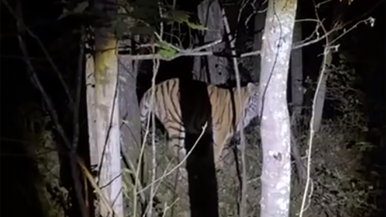 В опубликованном видео видно, как в свете ручного фонаря на расстоянии нескольких метров стоит полосатый хищник.