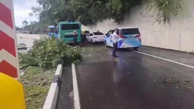 Первые вестники непогоды дали о себе знать в Сочи. Огромное дерево не выдержало ветра и рухнуло на проезжую часть, накрыв пассажирский автобус.