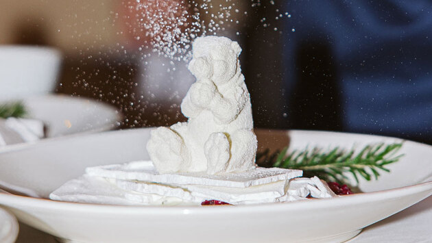 На десерт подали «визитную карточку» новосибирского ресторана – сибирского мишку с напылением из белого бельгийского шоколада, хвойным мороженым, клюквой и кедровыми орехами.
