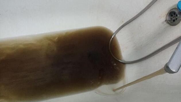 «Уже 2 недели подряд бежит вот такая рыжая вода, холодная, горячая менее рыжая, особенно плохая ситуация с холодной водой вечером и в выходные дни, она практически черная, с песком, УК «Прогресс» бездействует», — уточнил другой местный житель.