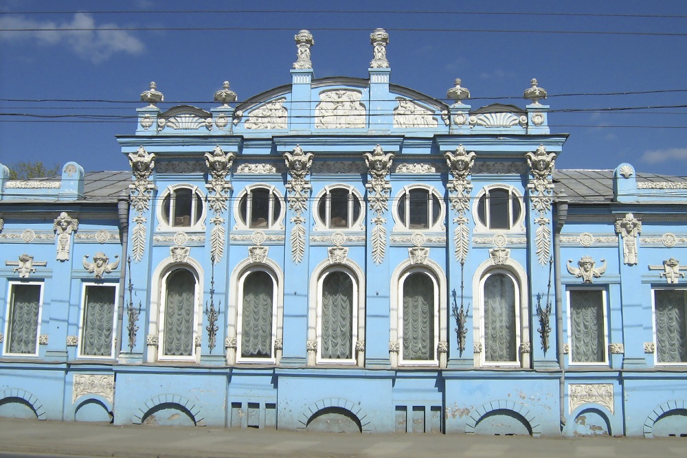 Особняк в стиле барокко с элементами модерна был построен в 1895-1897 гг. пермским архитектором Александром Турчевичем. Долгое время дом принадлежал купцу Сергею Грибушину. Фасад бело-голубого особняка декорирован в традициях коринфского ордера и богато украшен лепниной. Существует версия, что именно дом Грибушина описал в своем романе "Доктор Живаго" Борис Пастернак, который несколько раз бывал в Перми.