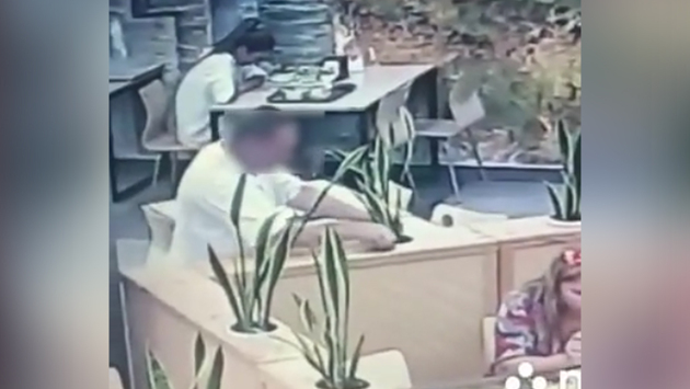 На видео мужчина, отдыхающий в кафе вместе с семьей, смотрит на цветок в горшке. Затем он подходит к растению, переставляет его на свой столик, а после незаметно прячет его в свой пакет с вещами.
