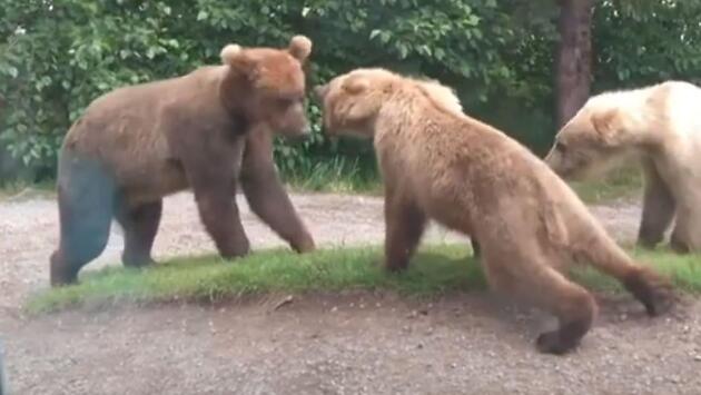 Три медведя не поделили тропинку на глазах у туристов на Аляске