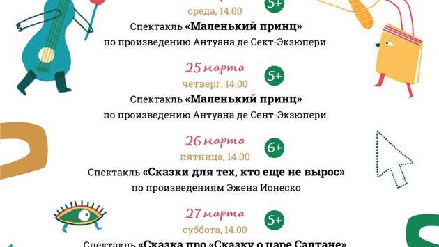 РАСПИСАНИЕ 23 марта 14.00 Спектакль "Невероятные путешествия барона Мюнхгаузена" по произведению Эриха Распэ 15.00 Музейная мастерская "Сундук Шереметевского чердака" 24 марта 12.00 Музейная мастерская "Какой прекрасный хор!" по стихам Бориса Заходера, Андрея Усачева и Михаила Яснова 14.00 Спектакль "Маленький принц" по произведению Антуана де Сект-Экзюпери 25 марта 12.00 Музейная мастерская "Кот поет, глаза прищурив…" 14.00 Спектакль "Маленький принц" по произведению Антуана де Сент-Экзюпери 26 марта 14.00 спектакль "Сказки для тех, кто еще не вырос" по произведениям Эжена Ионеско 27 марта 12.00 Музейная мастерская "Колечки и овечки" по стихам Михаила Яснова 14.00 Спектакль "Сказка про "Сказку о царе Салтане" по произведению А.С. Пушкина 28 марта 12.00 Спектакль "Питер Пэн или второй поворот направо, а дальше прямо до самого утра" по произведениям Джеймса Мэтью Барри 14.00 Музейная мастерская "Однажды, а может быть, дважды" по стихам Ренаты Мухи