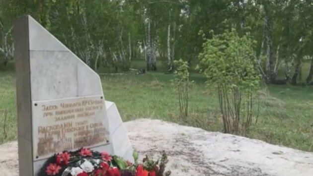 Накадрах ролика видно, что наопушке леса установлен монумент ввиде крыла самолета. Нанем высечены фамилии погибших наэтом месте летчиков: Марины Расковой, Кирилла Хиль, Николая Ерофеева иВладимира Круглева.