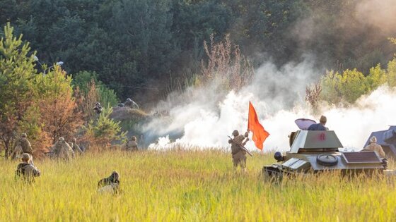 Взрываются танковые снаряды, раздается пулеметная очередь, поле затягивает густой дымкой. Зрители внимательно следят за происходящим, после завершения — не скупятся на аплодисменты.
