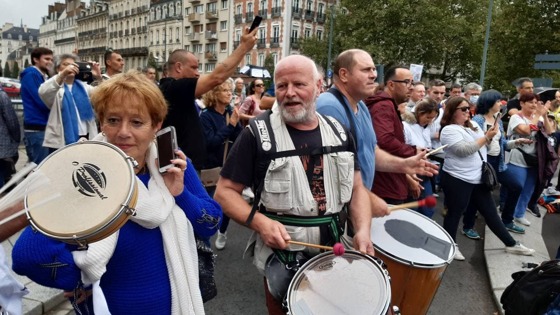 В столице Франции демонстрация проходит спокойно, люди идут организованной колонной, выкрикивают лозунги, бьют в барабаны.