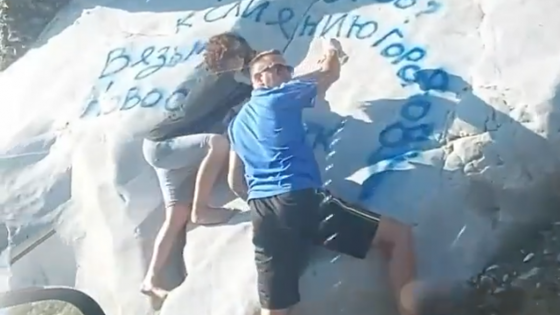Как сообщало ИА REGNUM, автор видео поинтересовался у разрисовывавших скалы туристов, для чего они это делают. Мужчина ответил, что они таким образом оставляют память в истории.