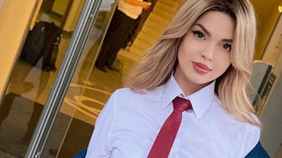На опубликованном снимке бортпроводница позирует в темно-синем брючном костюме и белой рубашке с воротничком. Из аксессуаров на ней надет красный галстук и черный кожаный ремень. Кроме того, девушка ярко накрашена, а ее волосы уложены легкими локонами.