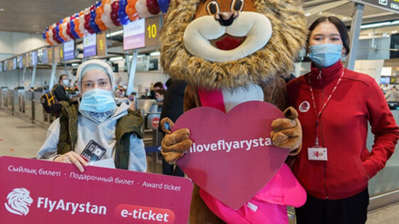 Пассажирам первого рейса вручили сладкие сюрпризы, а первому зарегистрировавшемуся путешественнику – ваучер на перелет по любому направлению авиакомпании FlyArystan.