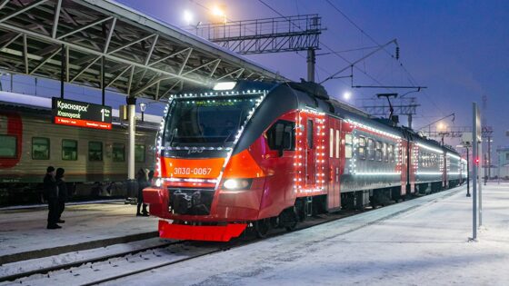 В первый новогодний рейс по маршрутам Красноярска отправился электропоезд КрасЖД, украшенный праздничной иллюминацией