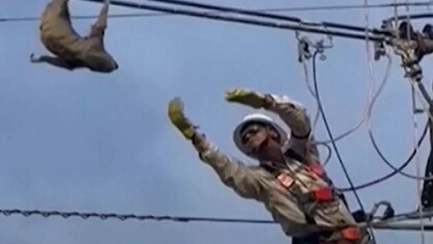 Рабочий при помощи уговоров спас повисшего на высоковольтных проводах ленивца