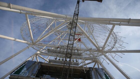 Главная выставка страны живет без колеса обозрения несколько лет - старое в 2016 году разобрали как ставшее небезопасным. Новый аттракцион "Солнце Москвы" возводится рядом с павильоном N7 ВДНХ. Собирают его частями, как конструктор. Колесо уже полностью замкнулось. Сейчас монтажники устанавливают крепления под кабины. Кронштейны "насаживаются" снизу, у основания аттракциона, затем колесо проворачивается и собираются следующие элементы. Ожидается, что в марте доставят со склада и начнут развешивать кабины, оснащенные системами кондиционирования, отопления и освещения. Всего их будет тридцать. Каждая шестая - с прозрачным люком.
