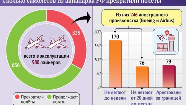 В марте перевозчики отправили на стоянки тридцати аэропортов 246 самолётов Airbus и Boeing. Из этого количества бортов 76 не летали от 20 дней до месяца, ещё 170 — от недели до 20 дней, пишет газета «Известия» со ссылкой на данные сервиса отслеживания полётов Flightradar. В аэропорту Шереметьево припарковано 116 лайнеров, в Домодедове — 25, во Внукове — 47. Разное количество самолётов — от одного до 12 — припарковано в Санкт-Петербурге, Сочи, Новосибирске, Екатеринбурге, Уфе, Минеральных Водах, Красноярске, Тюмени, Сургуте, Владивостоке и Хабаровске.