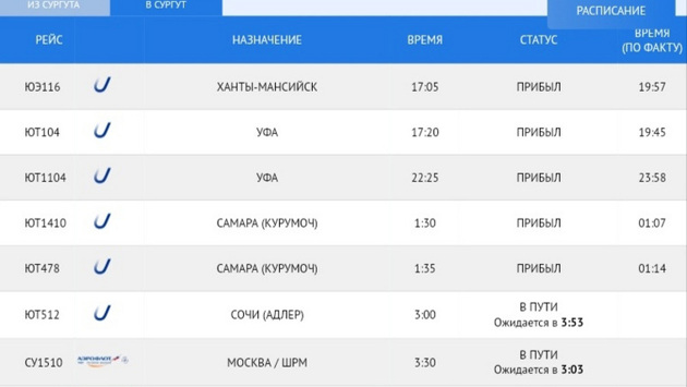 «Рейс ЮТ512 „Сочи (Адлер) — Сургут“, прибытие ожидается в 3:53. Рейс ДР501 „Махачкала — Сургут“, прибытие ожидается в 8:40», — информирует онлайн-табло аэропорта Сургута.
