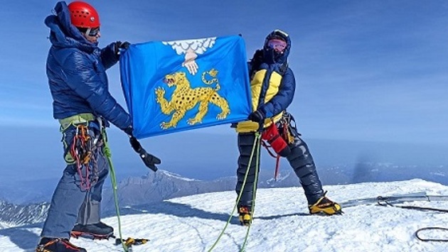 Туристы из Пскова развернули флаг области на вершине Казбека в Грузии