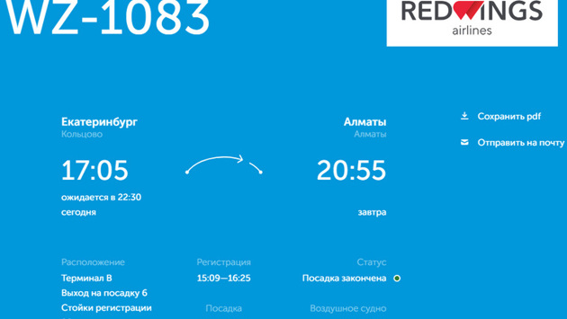 Рейс WZ-1083 авиакомпании Red Wings из Екатеринбурга в Алматы должен был вылететь 7 апреля в 17:05, однако из-за задержки вылетел только в 22:30, следует из данных на онлайн-табло аэропорта Кольцово. С чем именно связана задержка не указано.