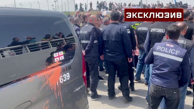 Силовики задерживают тех, кто пытается прорваться через оцепление к аэропорту в Тбилиси, как только приземлился самолет из Москвы. Некоторые протестующие пытаются отбить у полиции задержанных. Дебоширов сажают в микроавтобусы, испачканные краской.