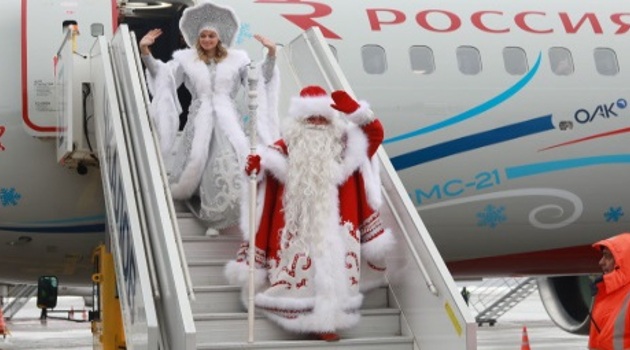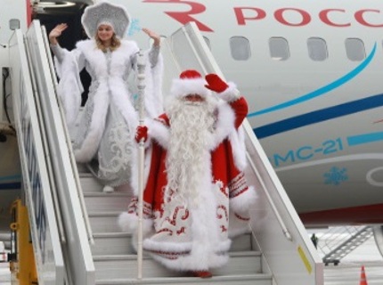 На опытном образце авиалайнера МС-21 в Нижний Новгород прилетели Дед Мороз и Снегурочка